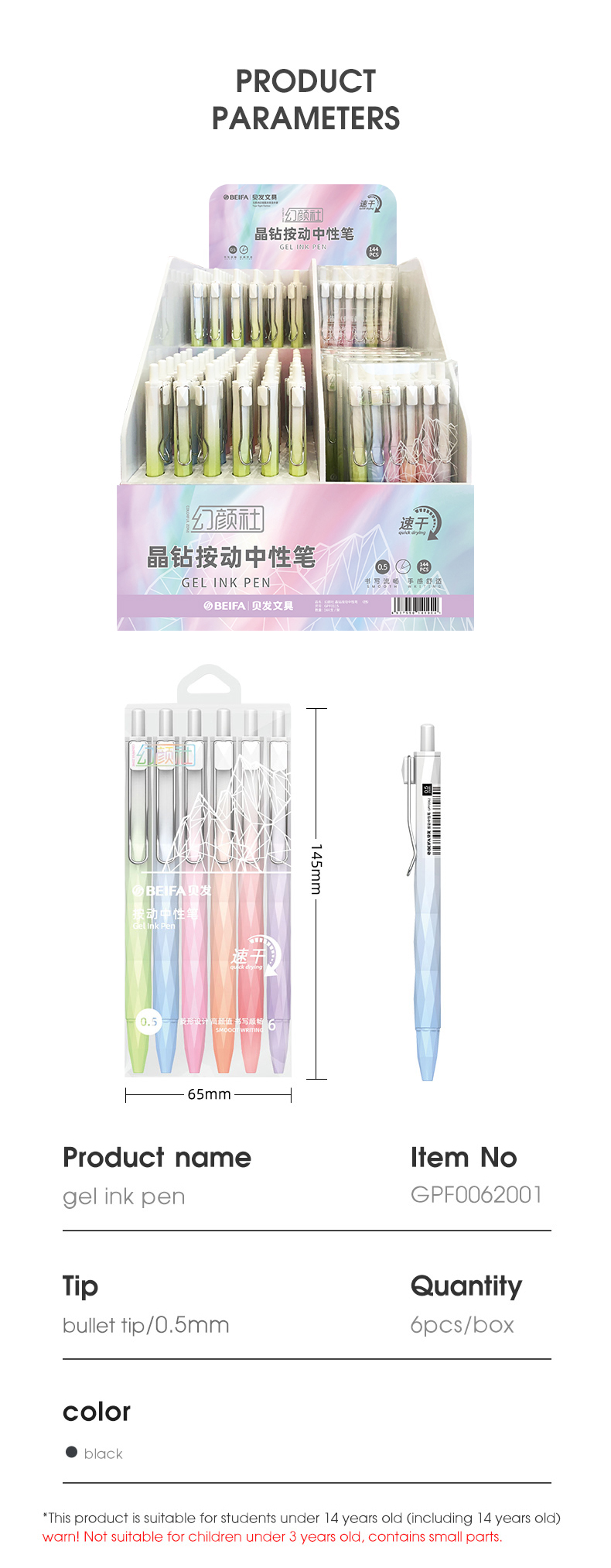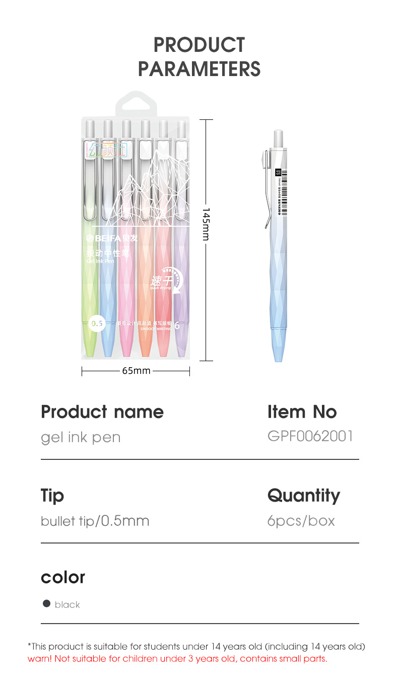 Набор гелевых ручек автоматические BEIFA GPF0062001 0.5мм черные чернила ПЭТ коробка 6шт/упаковка