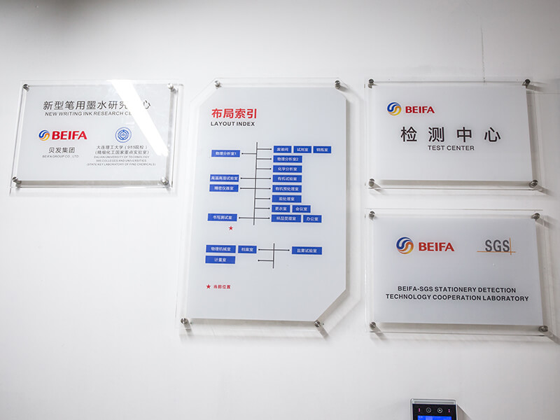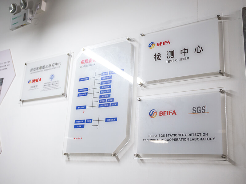 Испытательный центр Beifa был создан в 1998 году. В основном он отвечает за тестирование производительности наконечников для пишущих принадлежностей: шариковые и гелевые ручки, текстовыделители, маркеры перманентные и для досок, а также другое применение. Возможности тестирования являются ведущими в отрасли и тесно сотрудничают с Международными сторонними испытательными лабораториями SGS, BV, TUV, ITS, а также Национальным Культурным и Образовательным центром и Даляньским технологическим университетом. Лаборатория имеет площадь 500 квадратных метров, а испытательное оборудование включает в себя пишущий круг, тестер тяжелых металлов, систему цифрового микроскопа, испытательный ящик для солевого распыления, испытательный ящик для испытания на переменную температуру, ультрафиолетовый световой ящик, тестер расхода воздуха и т.д., Всего 35 единиц, стоимость оборудования - 8 миллионов юаней. В испытательном центре работают 11 опытных и профессиональных инженеров. Кроме того, он располагает полной системой управления лабораторией, которая прошла процедуру аккредитации CNAS.