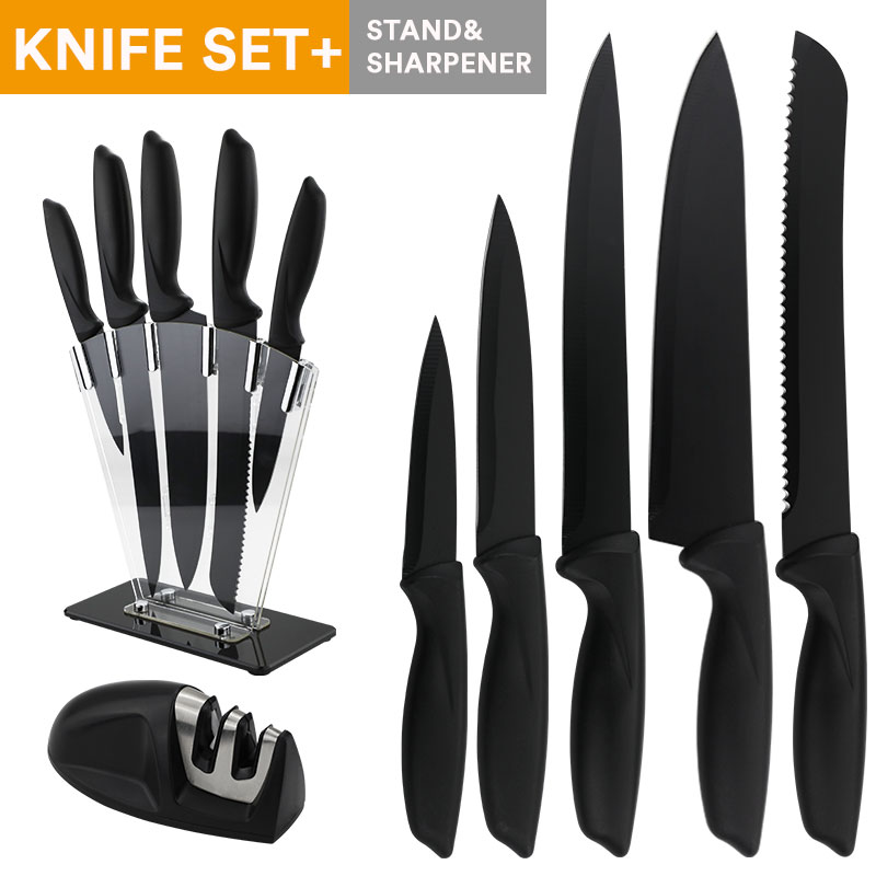 Материал: Лезвие: 3Cr13 с Антипригарным покрытием Ручка: PP Точилка: ABS+430 Блок: Акрил |